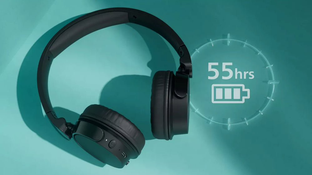 Con hasta 55 horas de reproducción, estos auriculares de diadema inalámbricos aguantan días entre carga y carga. Disfruta de un sonido excelente, Dynamic Bass para graves más profundos, incluso a volúmenes bajos, y un ajuste de retardo bajo para contenido de vídeo.